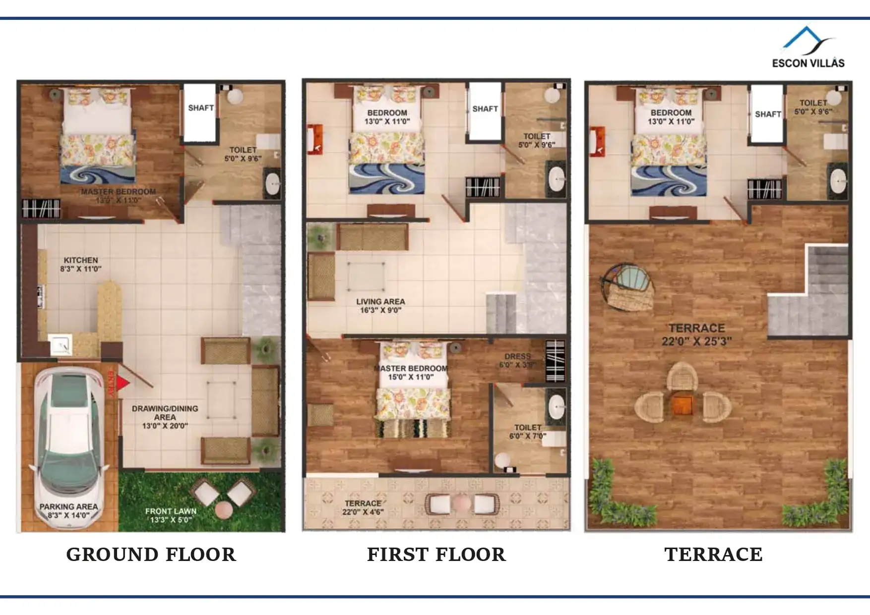 Ans: Escon Villas has 4 BHK and 5 BHK configuration with sizes ranging from 90 sq.yard to 161 sq.yard.