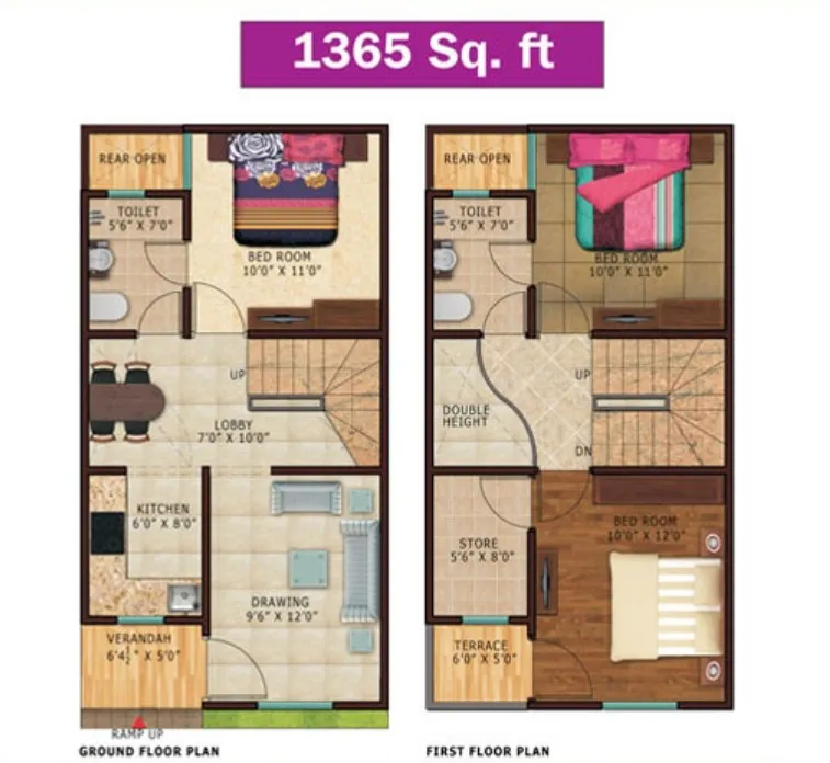 - Villa Size: 2 BHK Villa covers 650 Sq.Ft to 1015 Sq.Ft area with two bathrooms; and 3 BHK Villa covers 1365 Sq.FT area with two bathrooms and one kitchen.