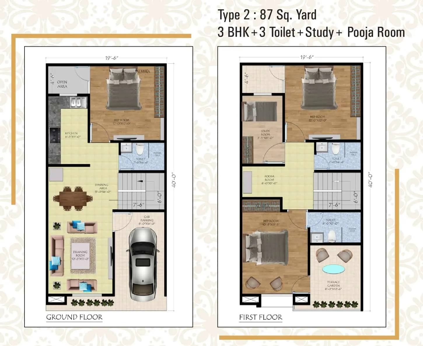 | 3 BHK + Study Room + 3T | 100 Sq.Yrd |