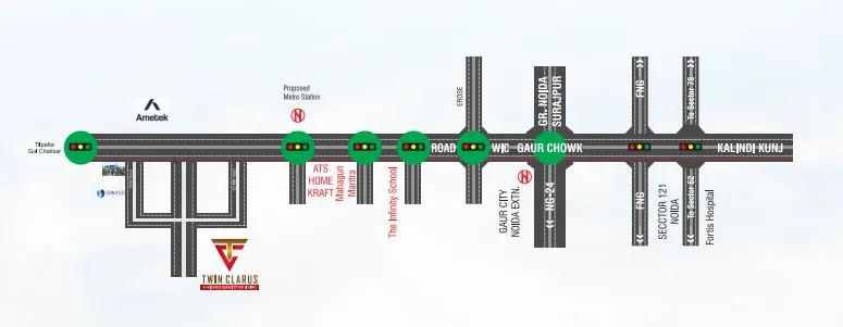 The Gaur Chowk is an 8-minute drive from the location, and Ghaziabad is 10 minutes drive from Twin Clarus. At a 15 minute distance, you can access 52 Noida metro station, and the Fortis Hospital sector 62 Noida is at 15 minutes drive. The pari chowk is located 4 to 5 km from the Twin Clarus.